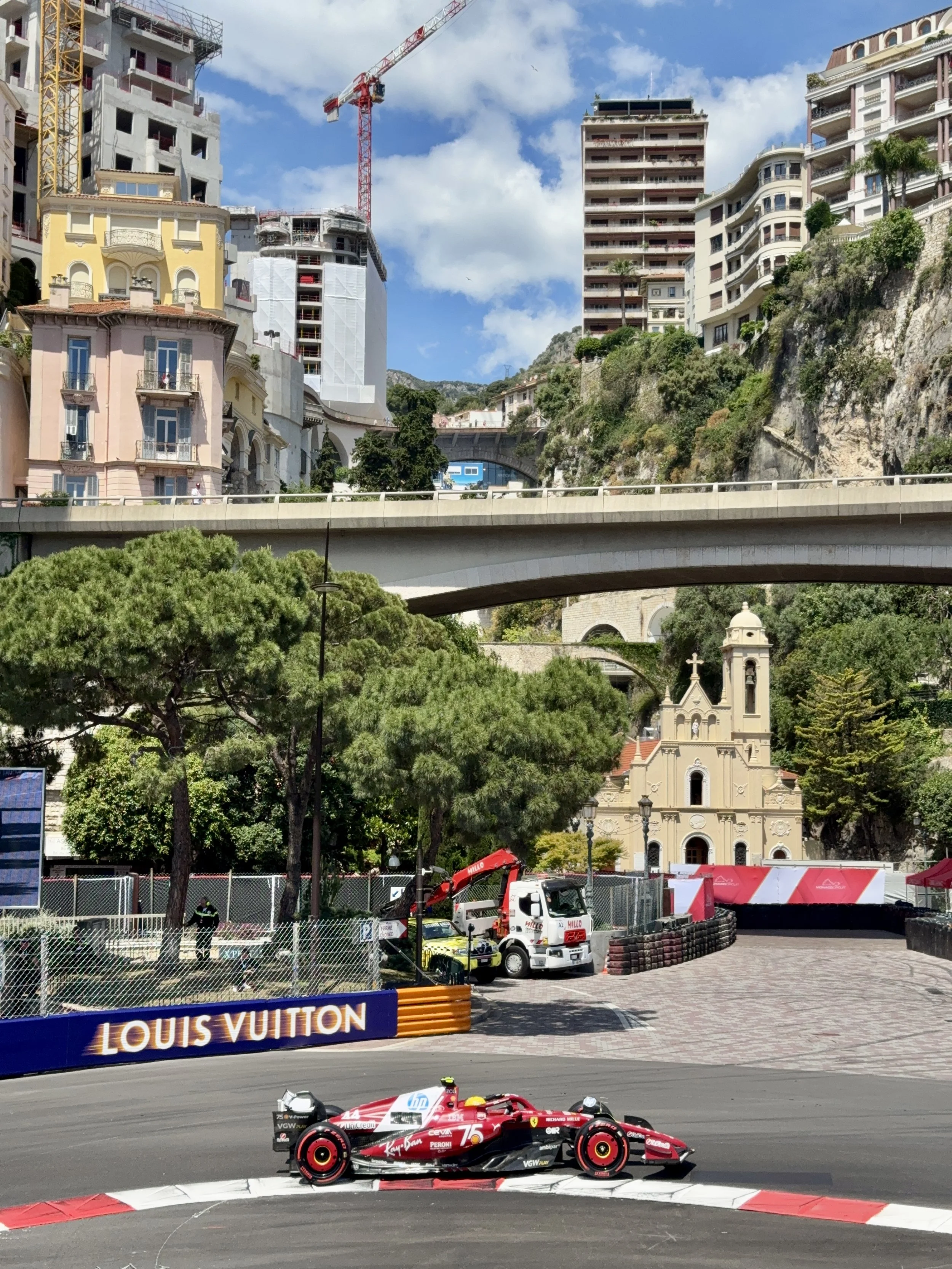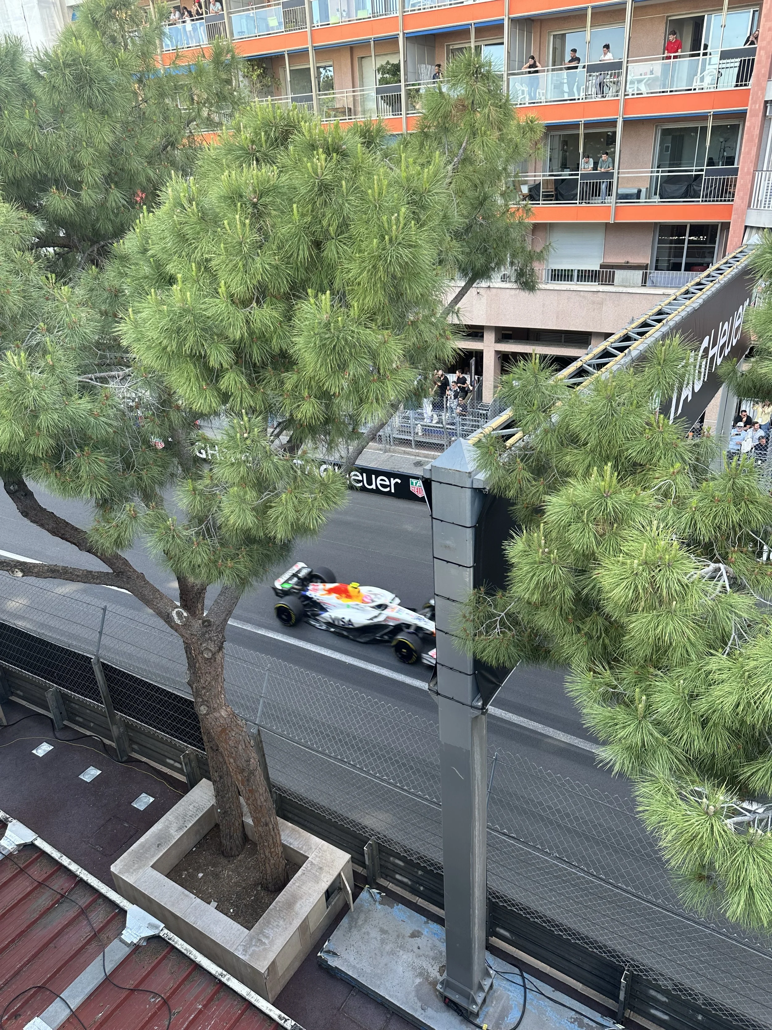 We decided to switch up where we sat each day. So for qualies we sat in the A grandstand and honestly after practice and sitting with the iconic yachts in the background, I didn’t think it could get better, but these seats did not disappoint! The grandstand itself was a lot smaller, so we weren’t dealing with a ton of people in the section and as you can see in my 3 different photos the different angles of what we could see and we got to see more iconic Monaco around us. As well as (my favorite part) we were so close we could see the drivers helmets! As shown in the my last picture I wore my Ferrari Charles Leclerc bow that I found on Etsy.