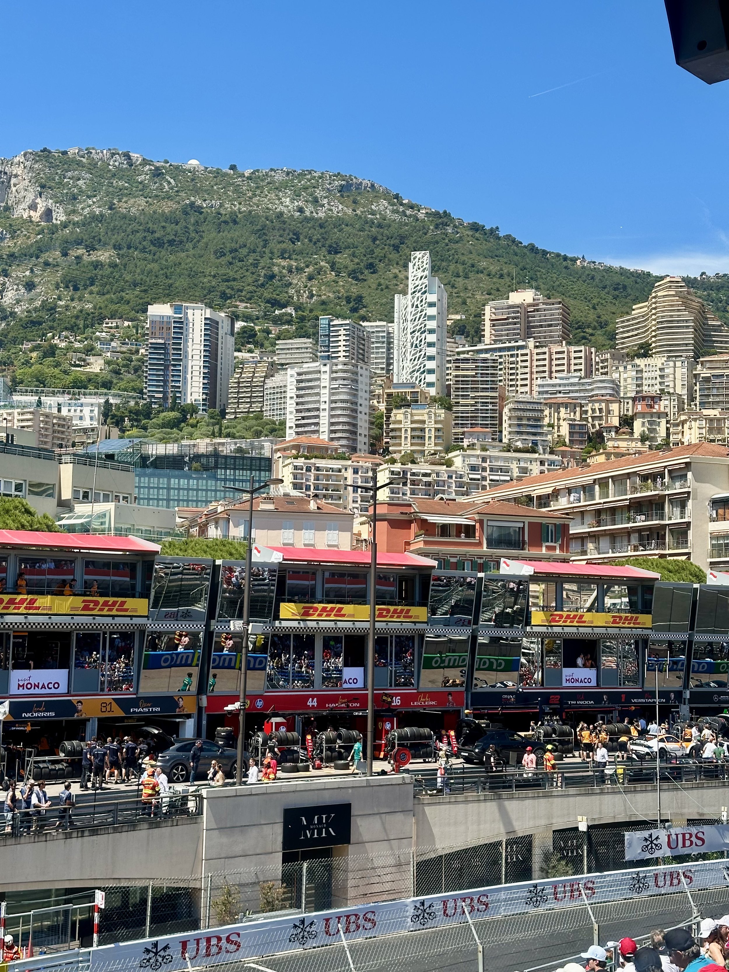 Lights out and away we go for the Monaco Grand Prix! Talk about chills! Remember how I said I didn’t think it could get better from our Day 1 seats? Well it did! For race day we sat in T2 grandstand and it was incredible. We wanted to get seats at the very back of the bleachers like we did for day 1, but when we got our tickets they were sold out of that whole top row, so we went one row down. I would do everything you can to get the last row, so you can stand and not have to worry about being in anyone’s way, especially if you are on the end. We sat as far left as T2 goes, so we could see them going around the corner and also come into the pit. Another thing that was nice about these seats was we were partially covered. We were able to see a lot from these seats. We saw the drivers walking around before the drivers parade, we saw the teams in the garages working on the cars, we could even see some of the guest famous people, including Jeff Bezos. On top of that we were able to see more iconic Monaco surrounding us, as you can see in picture 2 and 3. Picture 3 shows Old Town up above and if you look closely on the grass that is where some of general admission sat. You can also see in that picture part of the end of the straight we saw the drivers race in front of us, before they hit the turn and then in the next photo you can see where we would see them after the turn and that is also where they would come in to enter the pit lane. We were able to watch most teams pit stops. Although my favorite team/favorite driver didn’t win, good job to Lando for getting his first Monaco win.